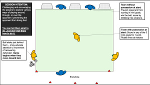 Representative information is information that is representative of what the player would need to pay attention to in the game. For example, in the 3v3 example below, promoting unrepresentative information – “Must complete 3 passes before you can score” – may get the players to look for passes, but it would shape their intentions and guide their attention away from what would be important in a game without that rule.